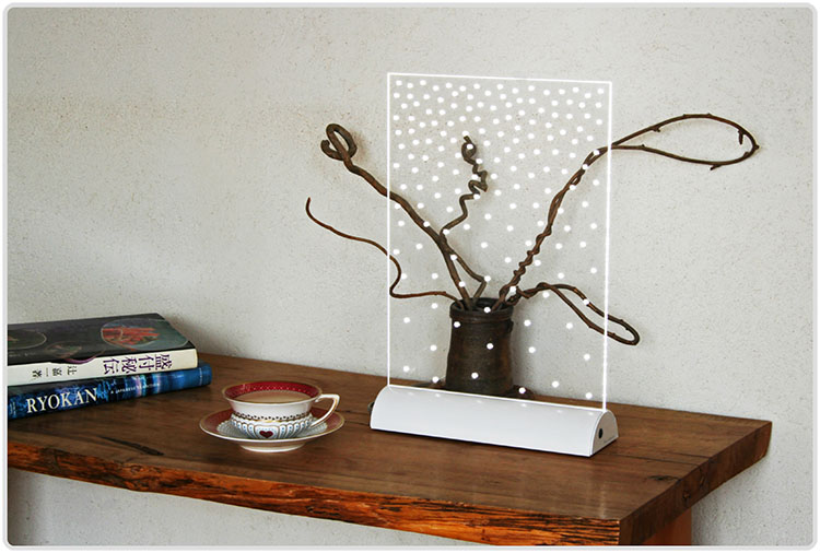 スノーフレークは当社が拠点を置く北海道のゆっくり降ると粉雪をモチーフにしたユニークなインテリア照明です。透明アクリル板の中を通る光が板に空いた穴によって散らされ、宝石のように明るく輝き出します。あなたのお好きなところにSnowflakeが魅惑的な雪景色をご提供します。