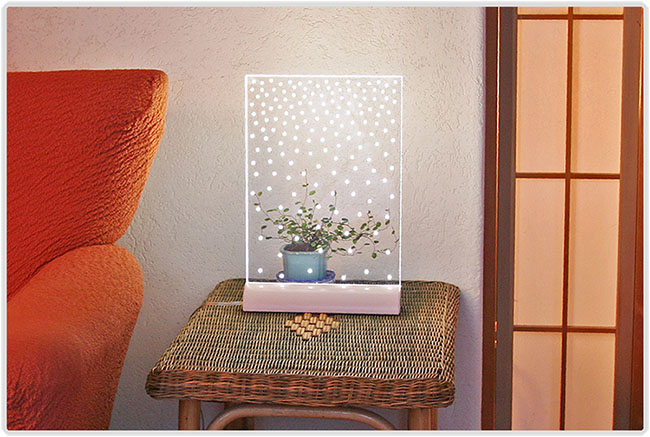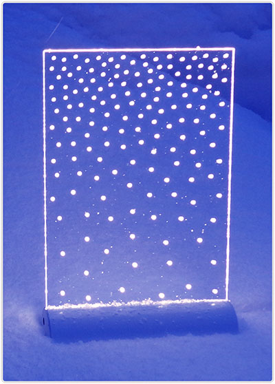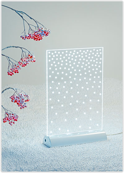 Snowflakeは最高品質の材料と高い技術力によって作られています。 透明なアクリル板の両面ハードコートにより、高い耐久性があります。 白色の粉末コーティングしたアルミ台座は高精度の仕上げ加工をし、コンパクトな曲面にデザインしました。 高輝度白LEDは高い信頼性のもとに動作します。また、Snowflakeには製造及び使用上での2年保証があります。