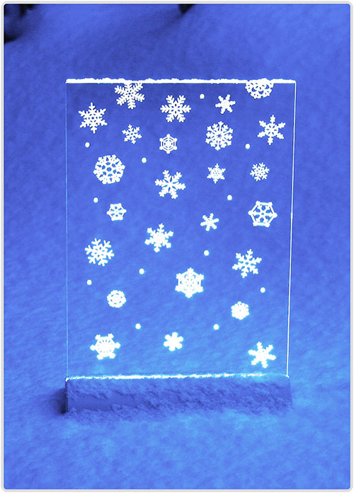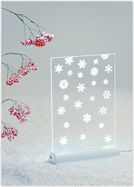 Snowflake Crystalは最高品質の材料と高い技術力によって作られています。 透明なアクリル板の両面ハードコートにより、高い耐久性があります。 白色の粉末コーティングしたアルミ台座は高精度の仕上げ加工をし、コンパクトな曲面にデザインしました。 高輝度白LEDは高い信頼性のもとに動作します。また、Snowflake Crystalには製造及び使用上での2年保証があります。