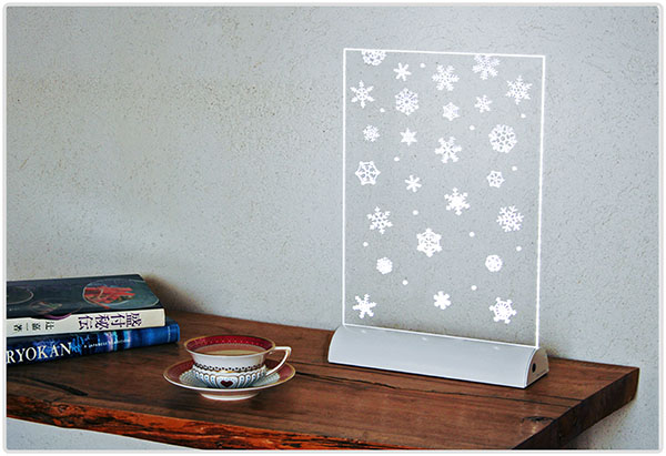 Snowflake Crystalは室内用ですが、あなたは部屋にいたまま外の雪景色を思い浮かべることができるでしょう。白いアルミ台座が静かに降り積もる雪を思わせてくれます。